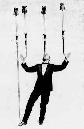 Feats of Balancing find, I think, more favour with the embryo Juggler than any other branch of our beloved science. This is scarcely to be wondered at. To practise the Art of Balancing needs no spacious gymnasium, no mats, or balls. In the dingy office, or the spacious drawing-room, in bed-room or back-yard, articles galore await his attention. Pens and pen-racks, chimney ornaments and fire-irons, chairs and water-jugs, brooms and coal-scuttles, naught comes amiss to the budding equilibrist.