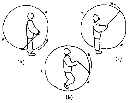 Figure 3.1 illustrates the correct timing for the jump. Referring to part (a) of the figure you'll see that the Vertical Loop is on the right side of the roper and spinning in the clockwise direction from the roper's point of view. Using spin acceleration to prevent the loop from closing, the roper begins pulling the spoke from the right to the left side of the body when the honda is at the 12 o'clock position. The pull must be timed so that the honda will have just passed the 6 o'clock position when the roper begins to jump. Part (a) of the figure illustrates the moment just before the jump begins. During the jump the roper continues to pull the spoke to the left as the honda passes through the point mid-way between 6 and 12 o'clock as illustrated in Figure 3.1(b). As the jump is completed the loop is now completely on the left side of the roper and the honda is at the 12 o'clock position. The roper then makes one complete circle on the left side of the body (i.e., the honda passes from 12 o'clock to 12 o'clock) with the honda now turning in the counter-clockwise direction.