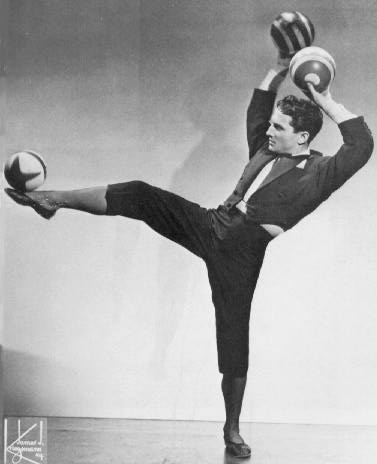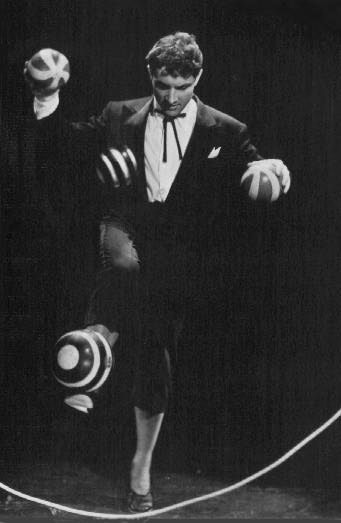 Here is an MPEG movie of Brunn kicking a ball behind his back to land on top of another ball spinning on his finger and here is one of his trademark combination trick. See the Great Jugglers of the Past section of the JIS Movie Theater for full descriptions.