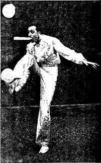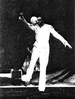 He always opened with a three sticks routine. Emphasis was on speed and the look of speed. It included the usual under the legs and behind the back continuous tosses, a shower which looked effective because it was done "sideways" (that is, with the spinning done on the plane parallel to his face), cascading the sticks upright without spinning, spinning the sticks on the top of his head as they went from one hand to the other, and a fast finish in which he actually held on to the sticks and swung them over his shoulders and back (really a kind of waving of the sticks which made them look like they were going twice as fast as they really were being tossed). All this was done with some little posed moves from time to time as he might break it up with things like placing the stick on the forehead for a short balance, etc.